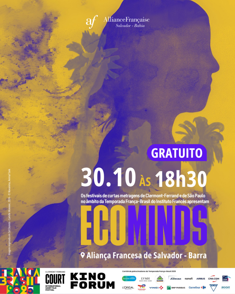 🌱🎬 A Aliança Francesa de Salvador convida você para uma exibição especial de curtas-metragens dedicada às questões ambientais! Dentro da programação da Temporada França-Brasil 2025, realizaremos uma sessão do projeto Eco Minds, iniciativa do Festival Internacional do Curta-Metragem de Clermont-Ferrand e do Festival do Curta-Metragem de São Paulo.