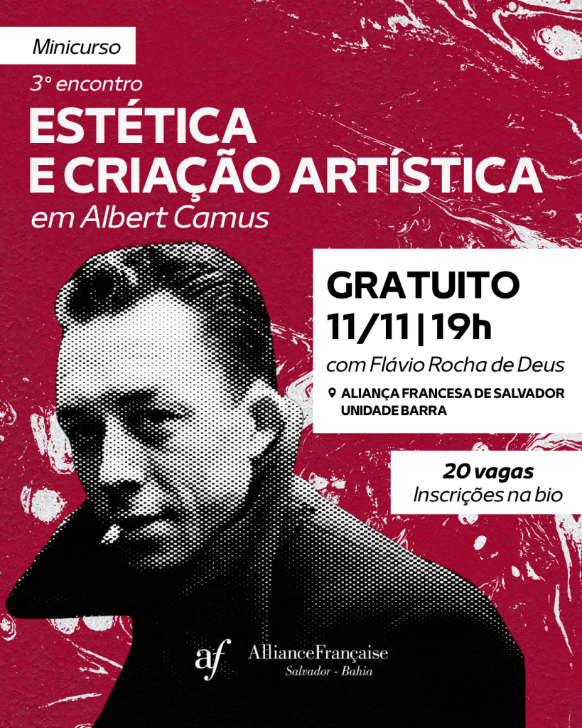 A Aliança Francesa Salvador – Bahia convida você para o terceiro encontro do minicurso Estética e Criação Artística em Albert Camus, a ser realizado em 11 de novembro (terça-feira), às 19h, em nossa Unidade Barra (Av. Sete de Setembro, 401 / 2726 – Ladeira da Barra).